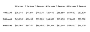 | 40% AMI Max Income | $36,040 | $41,160 | $46,320 | $51,440 | $55,560 | $59,680 | $63,800 |